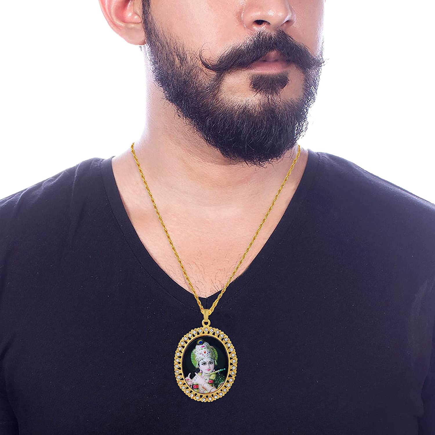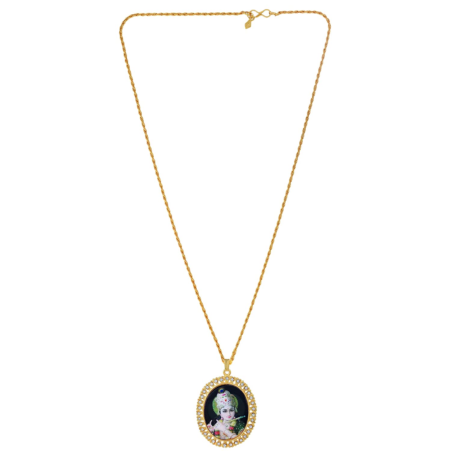 This rich looking Big and Bold Krishna Pendant is an ultimate Spiritual Jewellery pendant, inspired by Mural paintings on Benaras temples. Hand-crafted by traditional craftsmen from Bikaner, A super offering from our Spiritual Jewellry latest collection. The pendant is made from Pure Gold plated Brass, and lavishly studded with White Zirconia, A designer created Pendant from a Brand like Memoir, the Pendant is sure to make heads turn, and is an ideal pendant to wear at all occasions, specially on all big occasions, parties, Weddings, and all festivals etc. It matches with all dresses, and is also an excellent fashion cum Spiritual jewellery pendant. It can also be gifted, to people of all ages.
