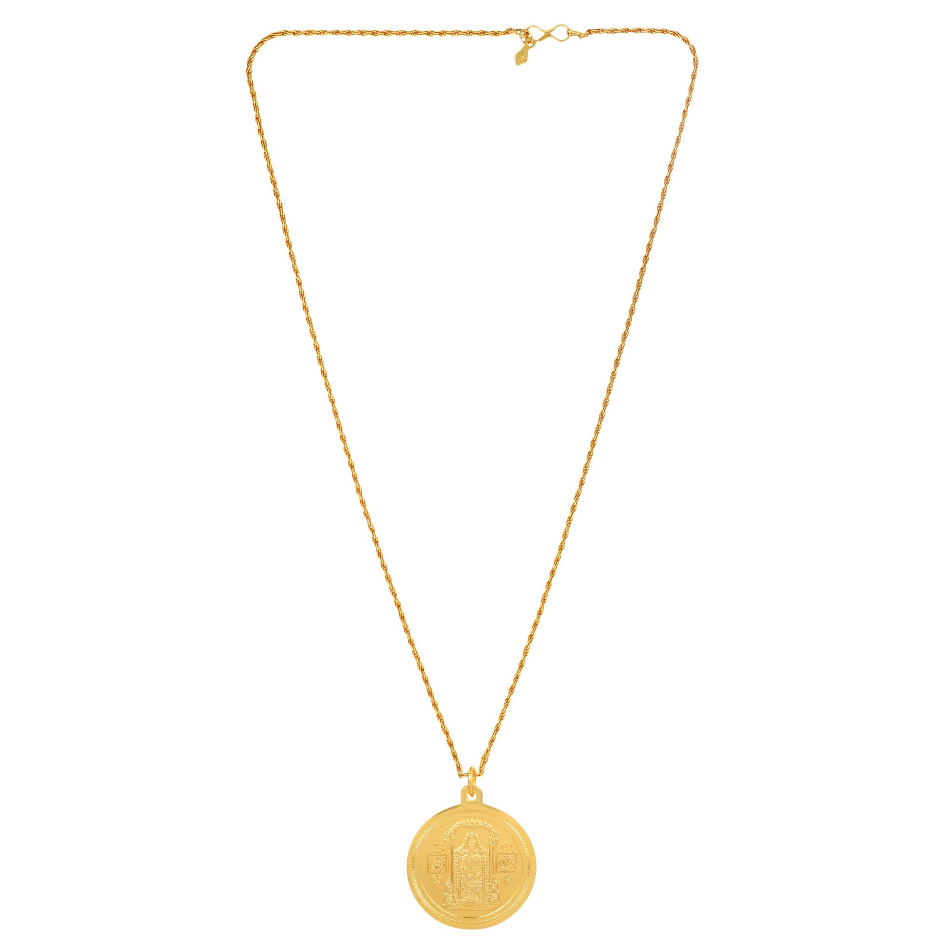• 22 KT super finish and shine, coin shape, both side wearable (reversible) Tirupati Balaji image engraved coin pendant with Chain. One side Tirupati image and another side Ganesh image. Reversible pendant.