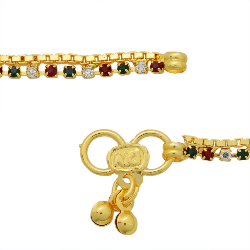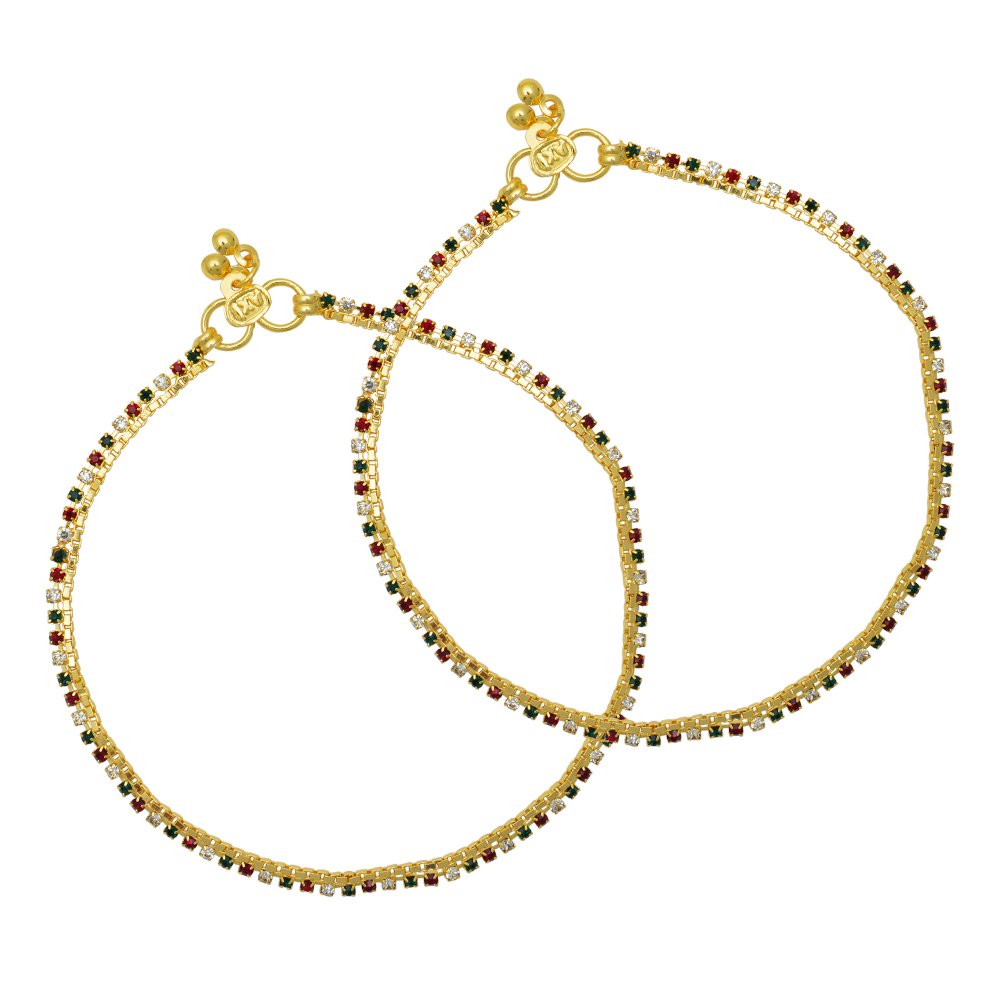 Gold plated Ruby, Emerald, Diamond Coloured prong CZ studded 10 Inch 12Gm real gold look, single liner rich looking Anklet