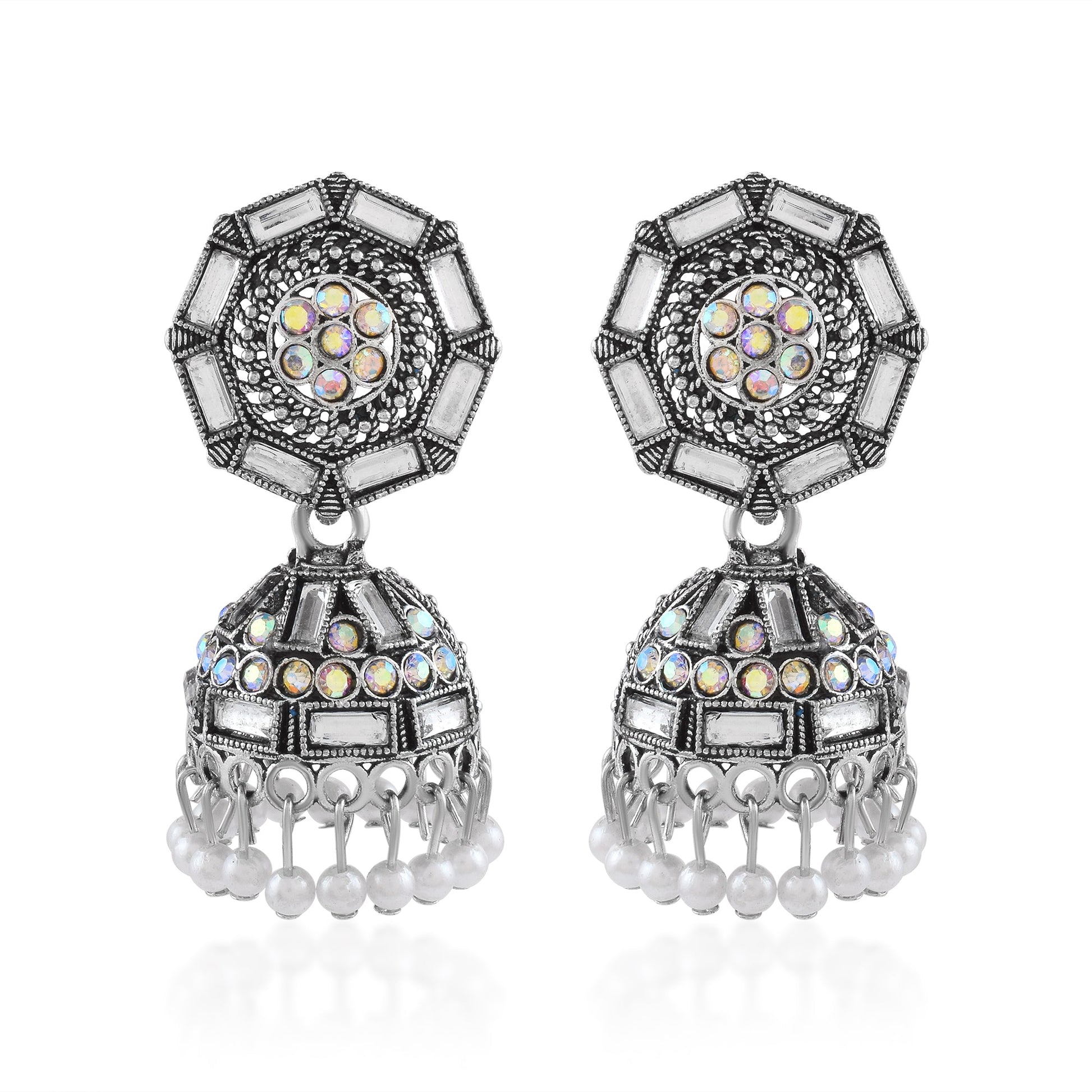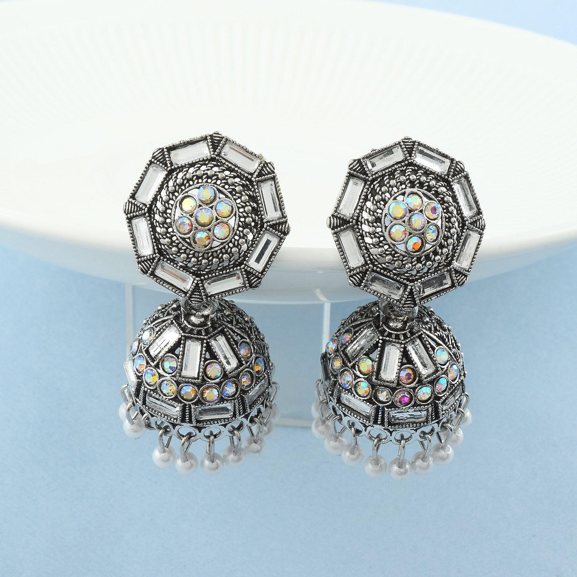 Brass Oxidised Silverplated Kundan Polki Traditional Women Jhumka Earrings (JHAT8522)