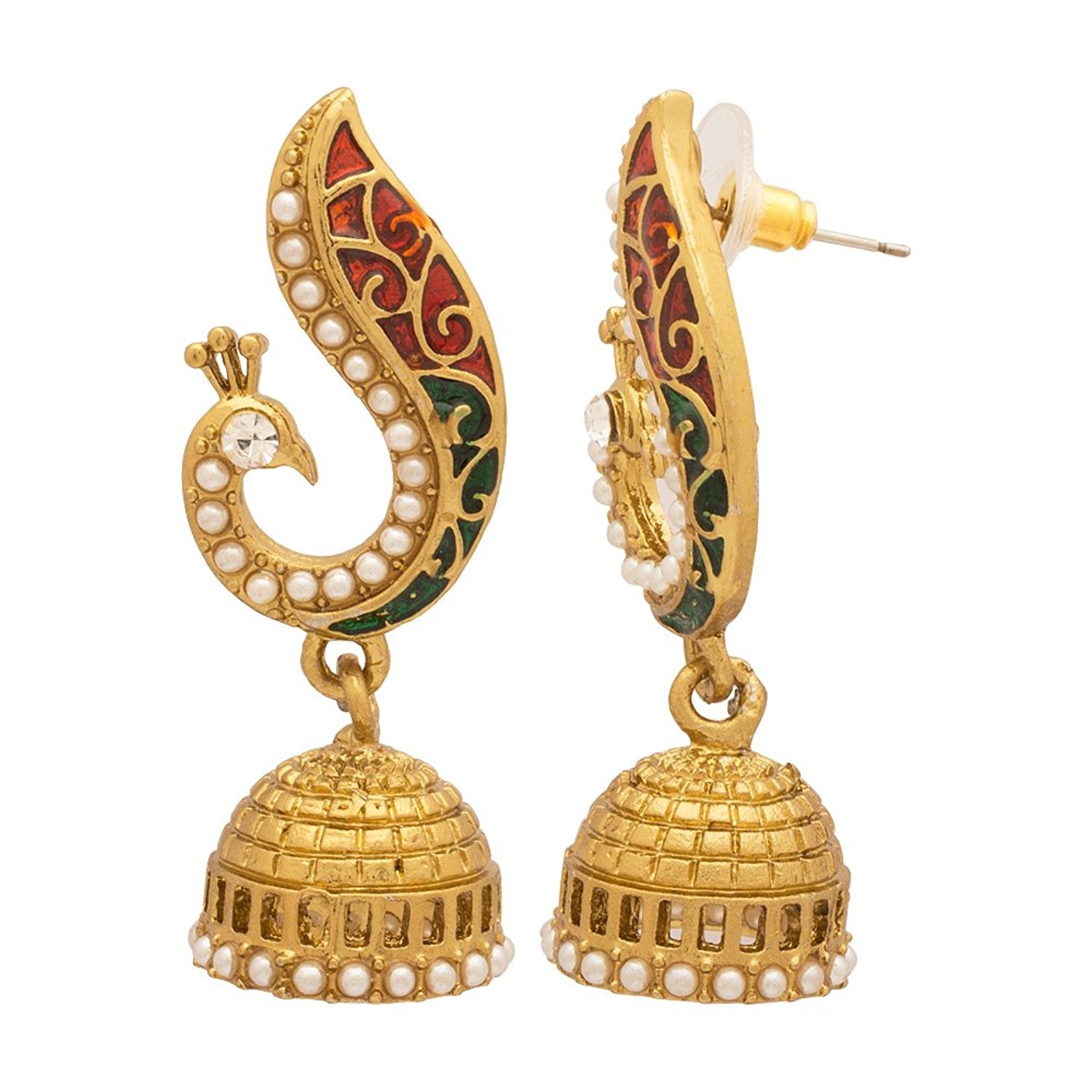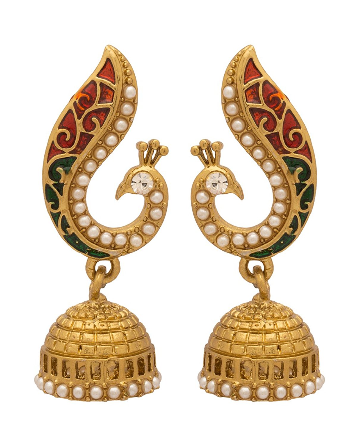 Gold Plated Colourful Meenakari Pearl Beaded Peacock Dangle & Drop Jhumki for Women