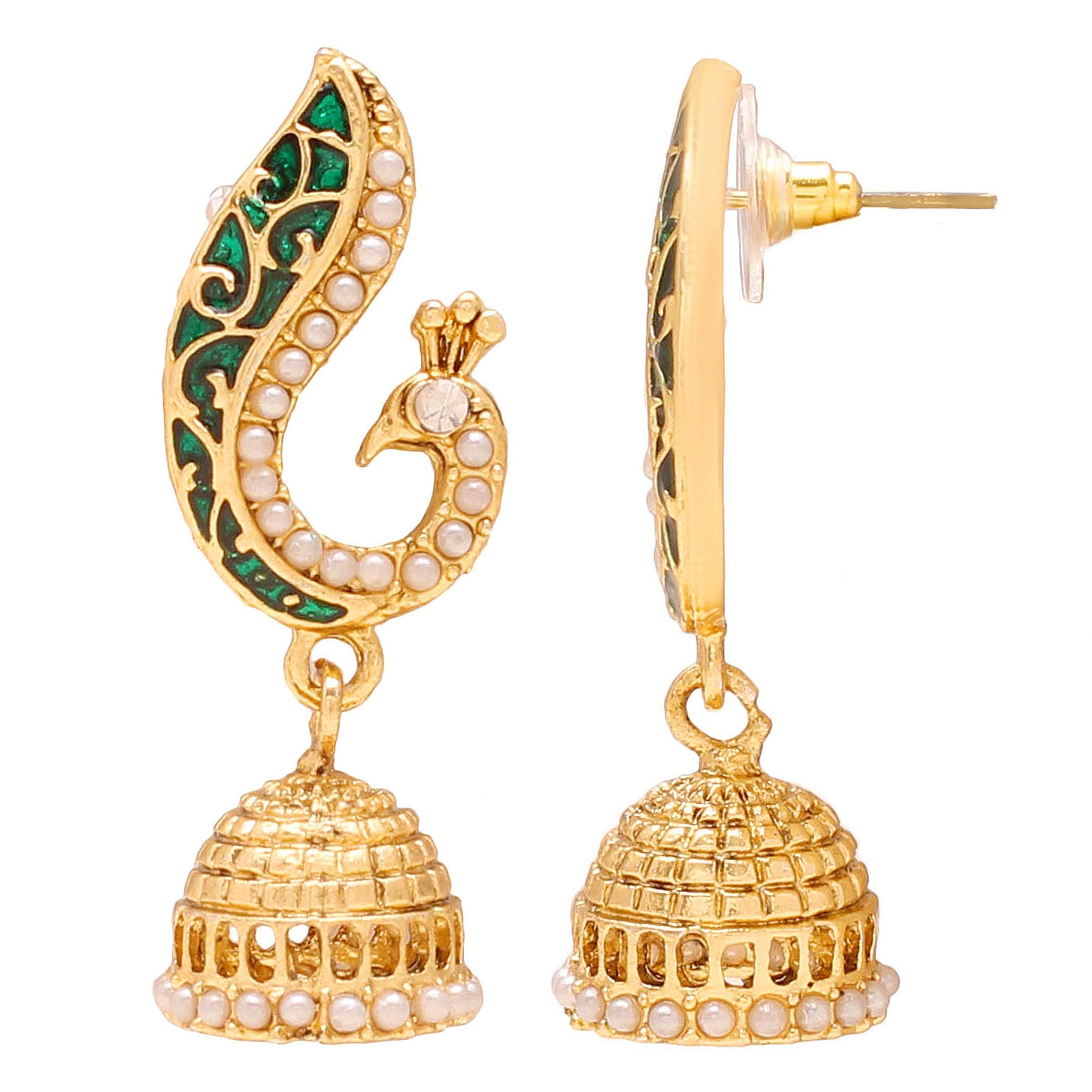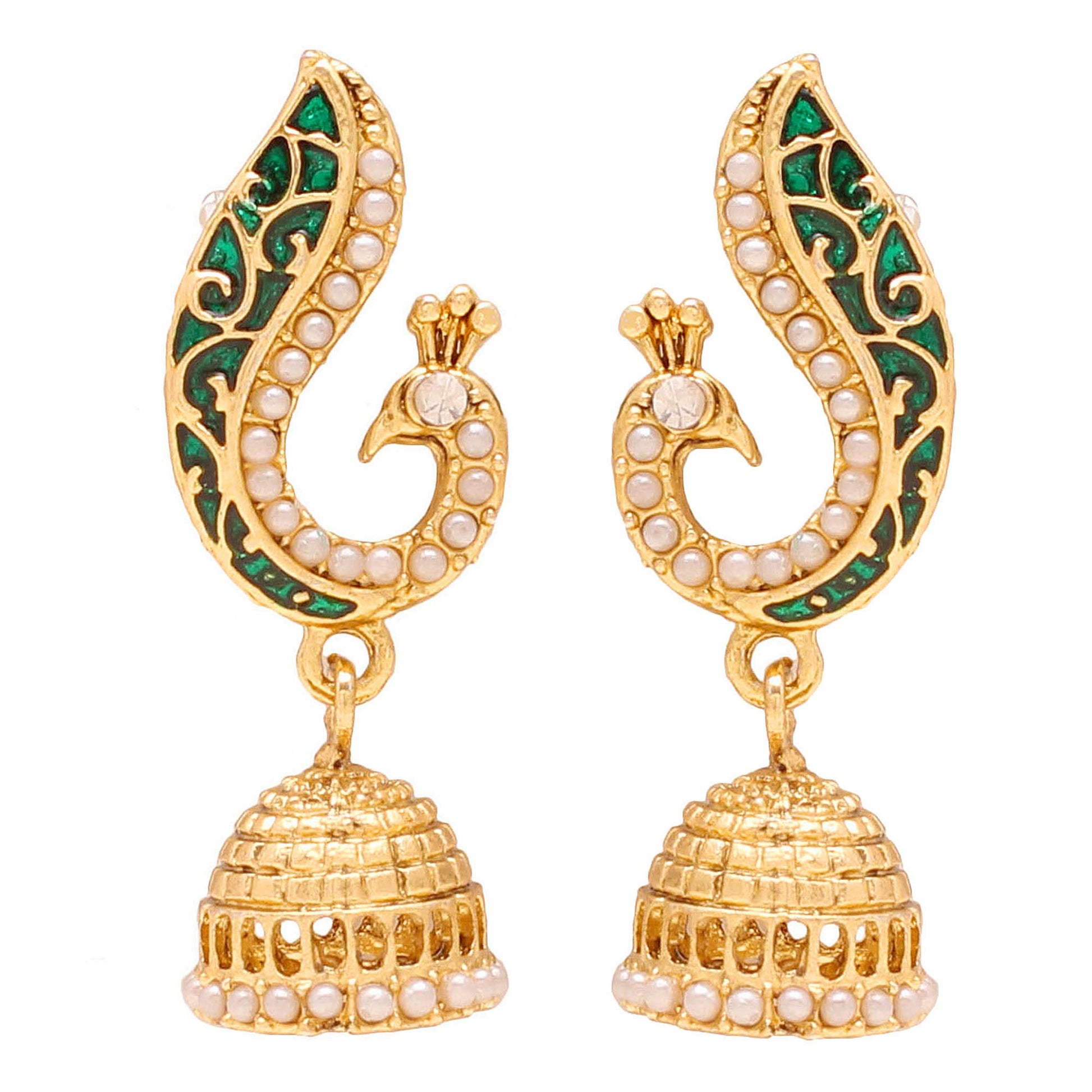 Gold Plated Green Meenakari Pearl Beaded Peacock Dangle & Drop Jhumki Earrings for Women