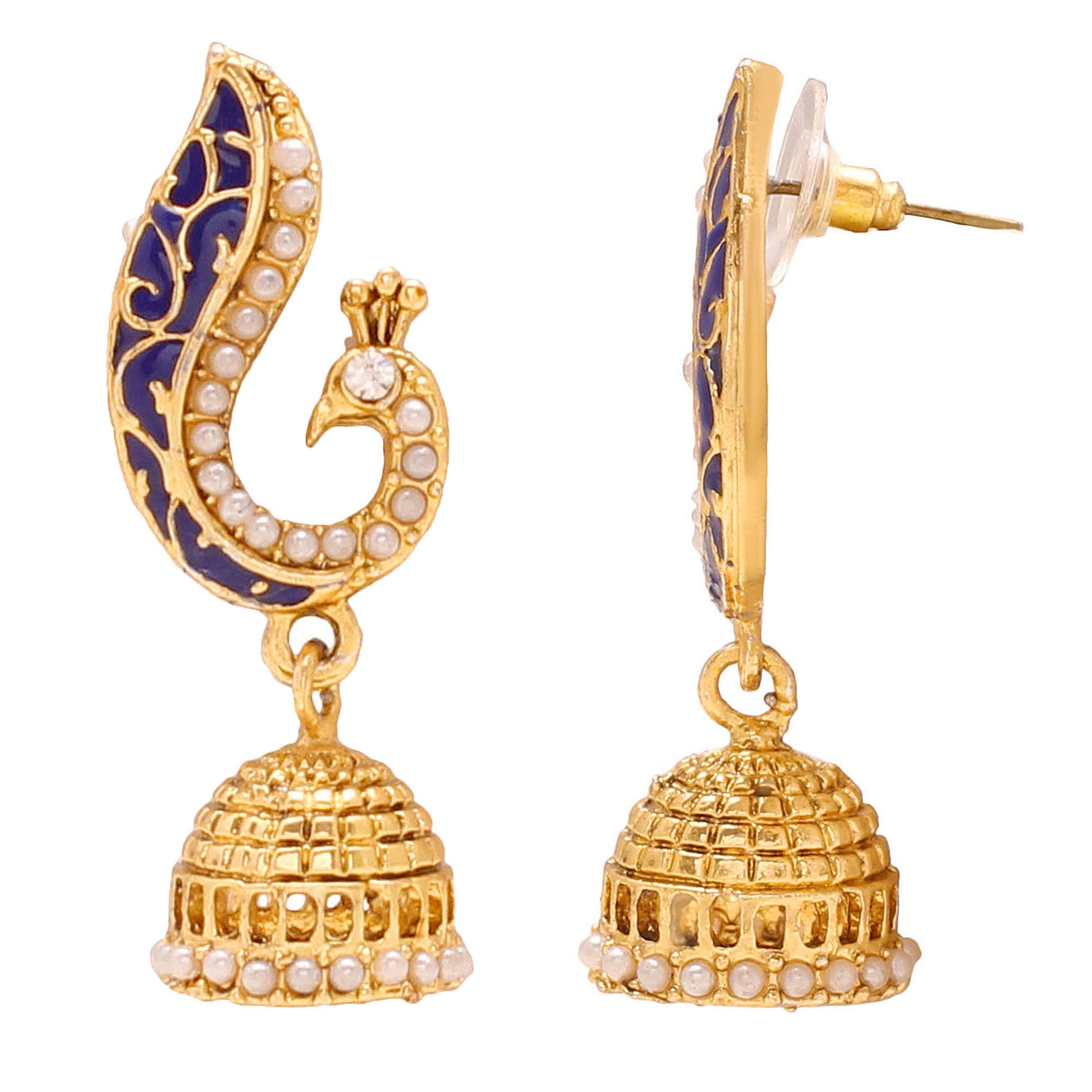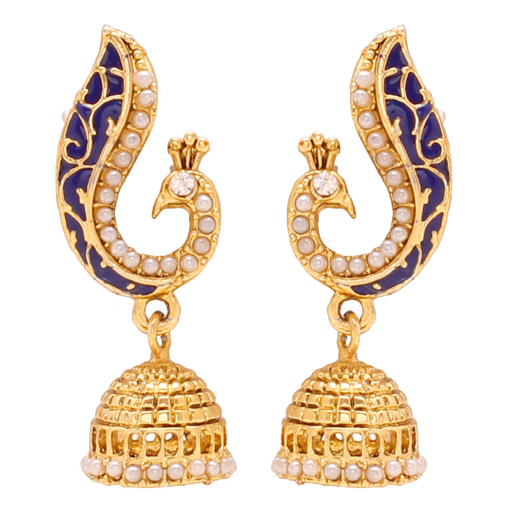 Gold Plated Peacock Blue color Meenakari Pearl Beaded Peacock design Dangle & Drop Jhumki Earrings