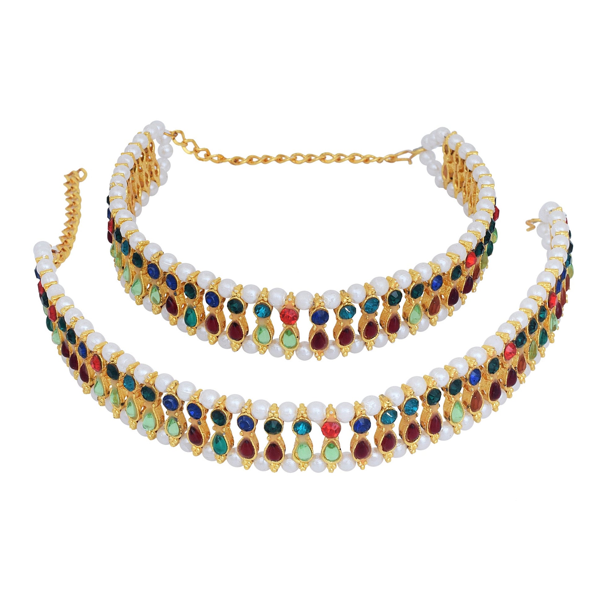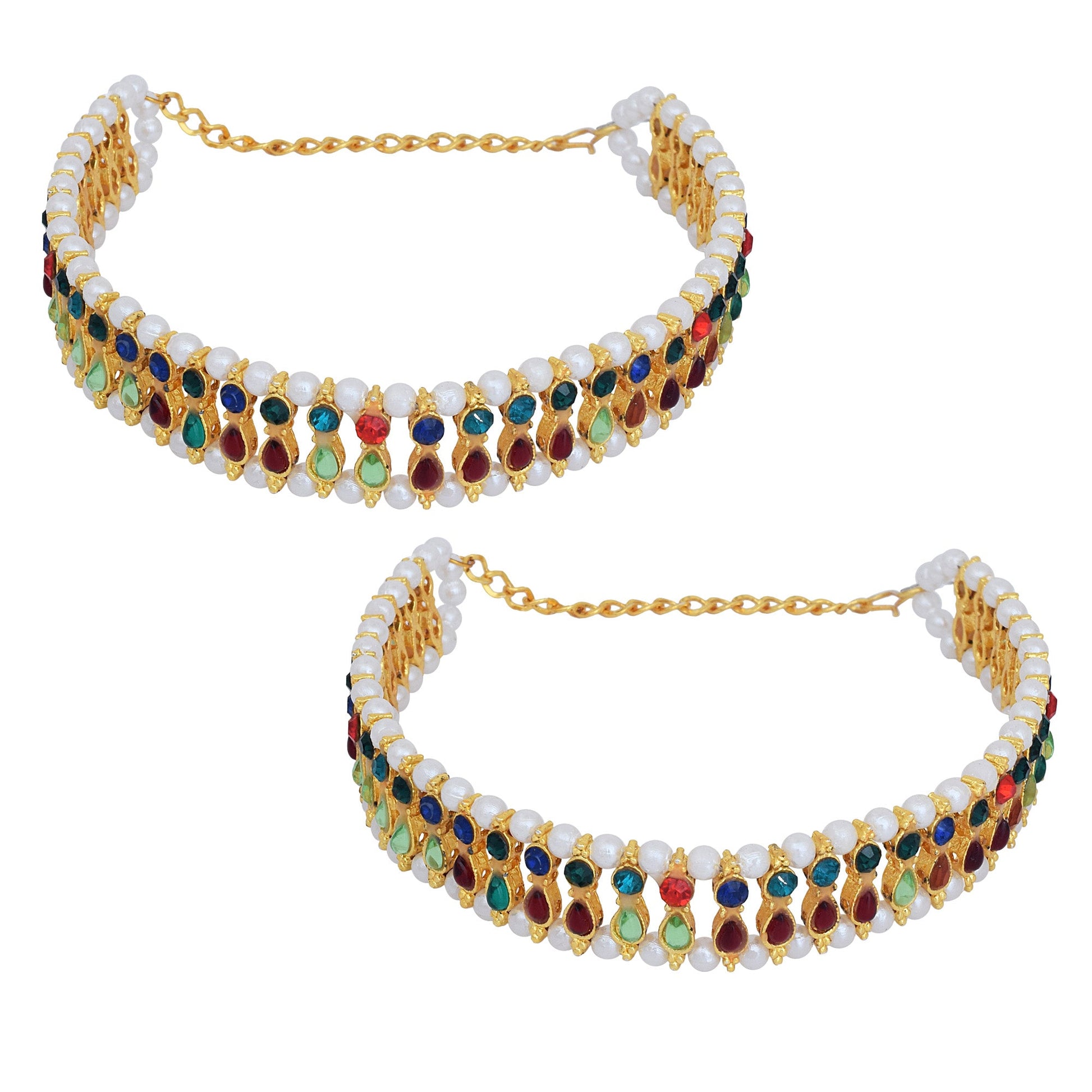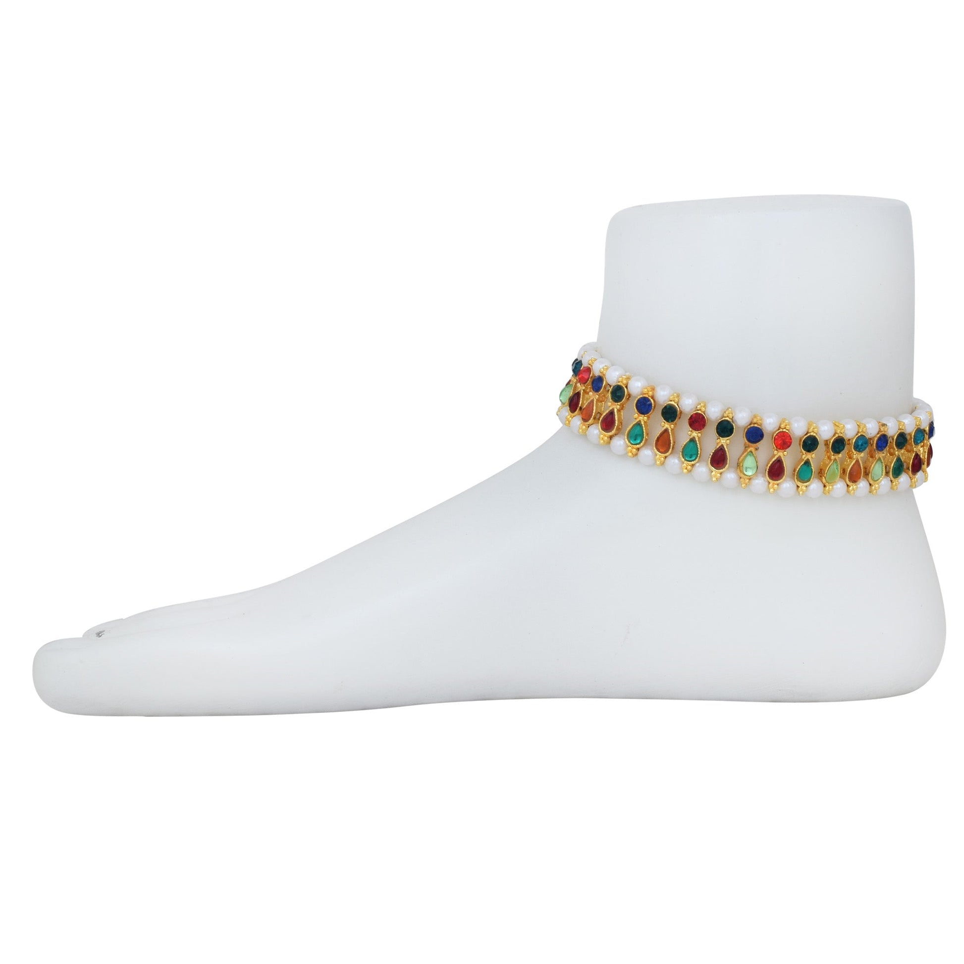 Gold plated brass, Pearl and Colourful Kundan studded, broad Patta (Strap) design Payal Pajeb Anklet