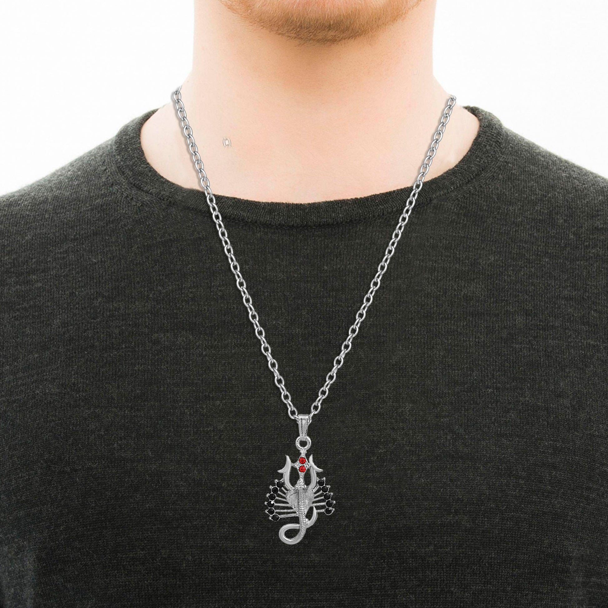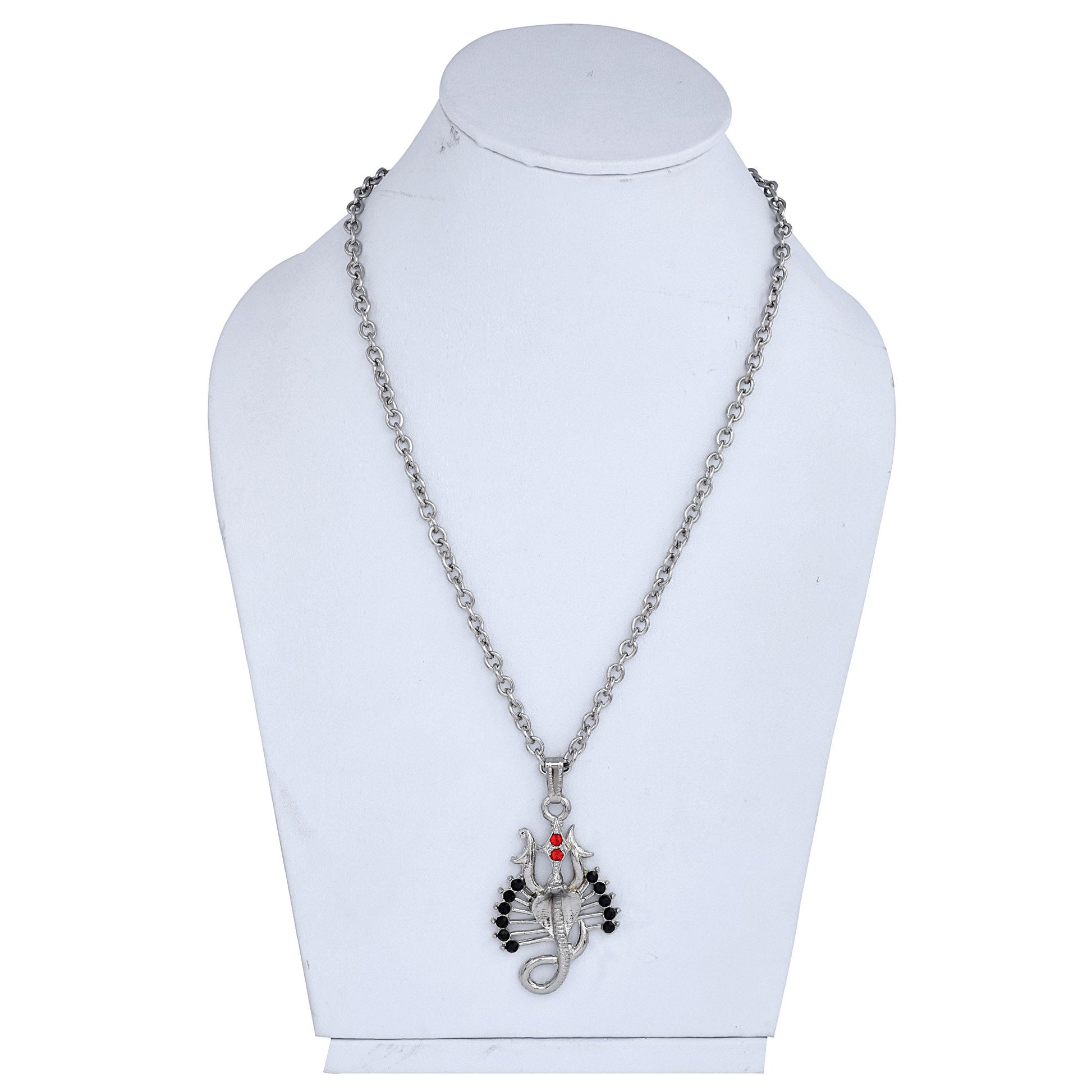 The ultimate spiritual pendant, this SHIV SYMBOLS pendant is attractive, stylish and elegant piece of Jewellery. The Pendant instills power and belief. The raised snake head image, this classic pendant, is one of a kind, and draws instant attraction. It also is a pendant, which can be traditional as well as fashion at the same time. Long length enables that it can be worn even outside the dresses to flaunt.Pendant made in Silver plated Brass, which gives it a rich, and expensive look. Thus this is a thoughtfully created meaningful pendant, which is made with 100% anti-allergy,skin safe metal. It can be worn by all genders, young and old. A very good gifting option, for all occassions and all age groups.