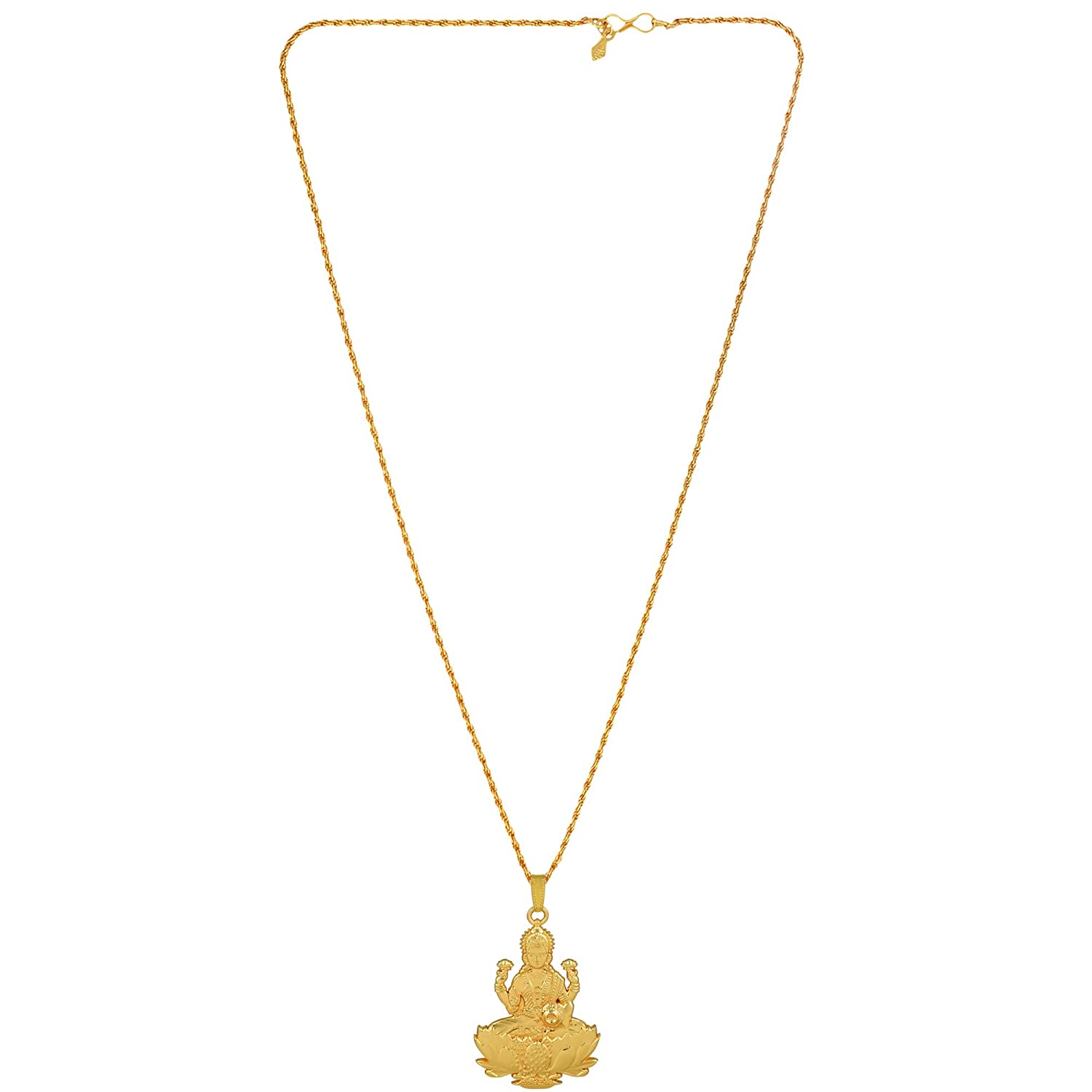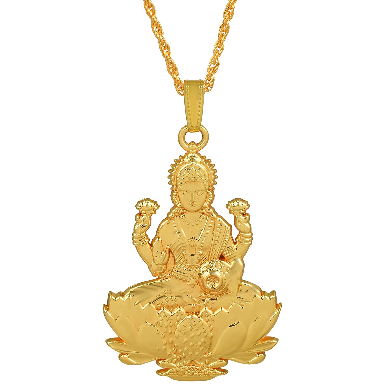 An excellent Jewellery masterpiece in form of a Stylish Lakshmi Pendant. Made of Pure Brass, the pendant is Micron Gold plated and further e-coated to make sure that it retains same shine and look, for a long period of time. Graphics designed in detail on Computer, and then created on Computer guided Laser CNC machines. The pendant is a brilliant result of Technology, combined with age old Indian Handcrafting techniques. A reversible pendant, the pendant is 2.5 X 1.5 Inch size with 34 Gms in weight. It comes with a 22 Inch brass Gold plated rope chain. The design is of Dhan-Lakshmi, which is an avtaar of Lakshmi which blesses enormous wealth and prosperity. An excellent chain pendant necklace, which looks good on both Men and Women.