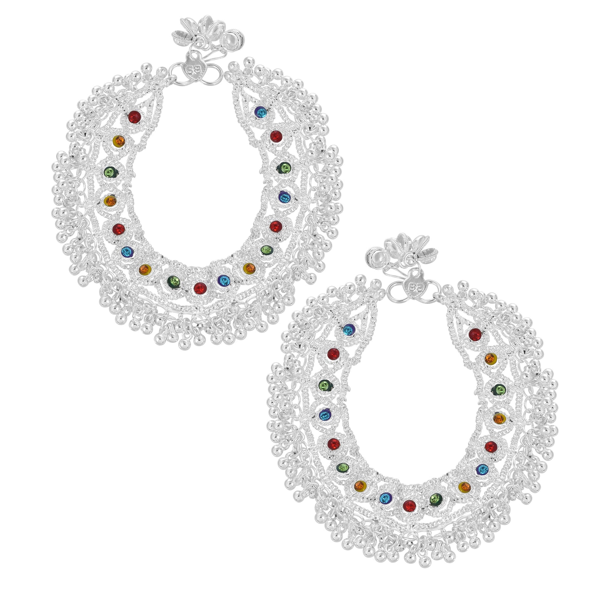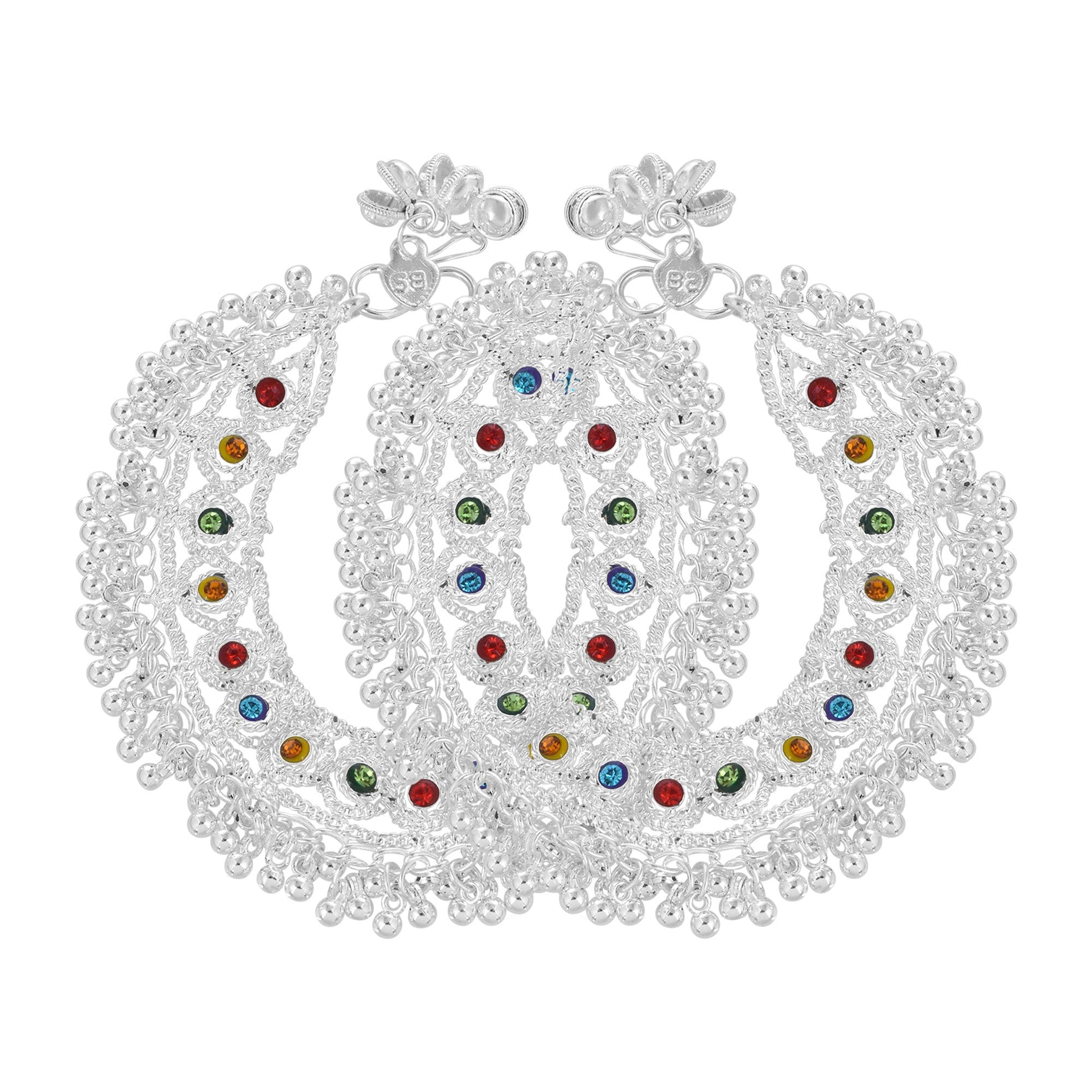 Silver plated Broad, Colourful CZ studded ghungru Traditional Payal