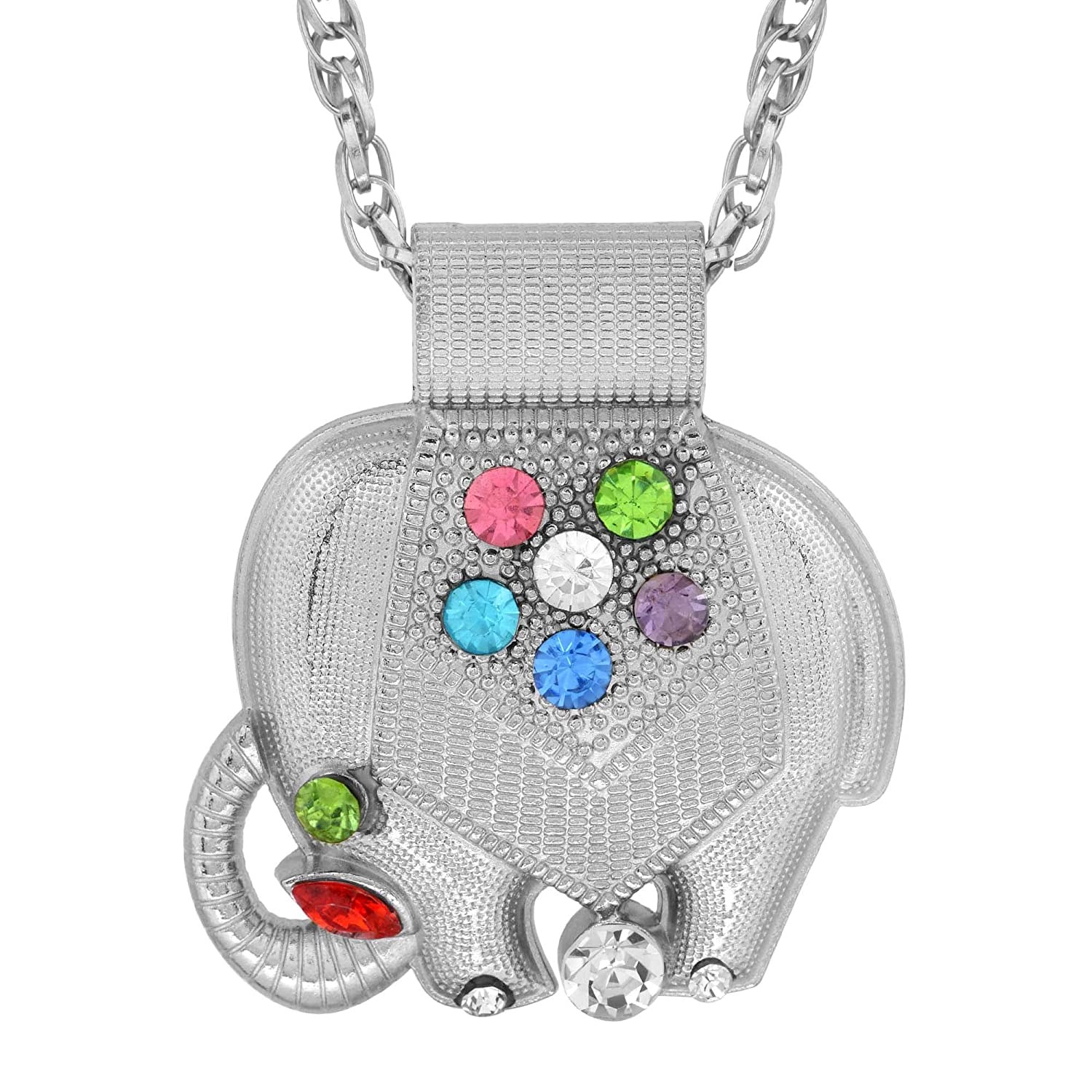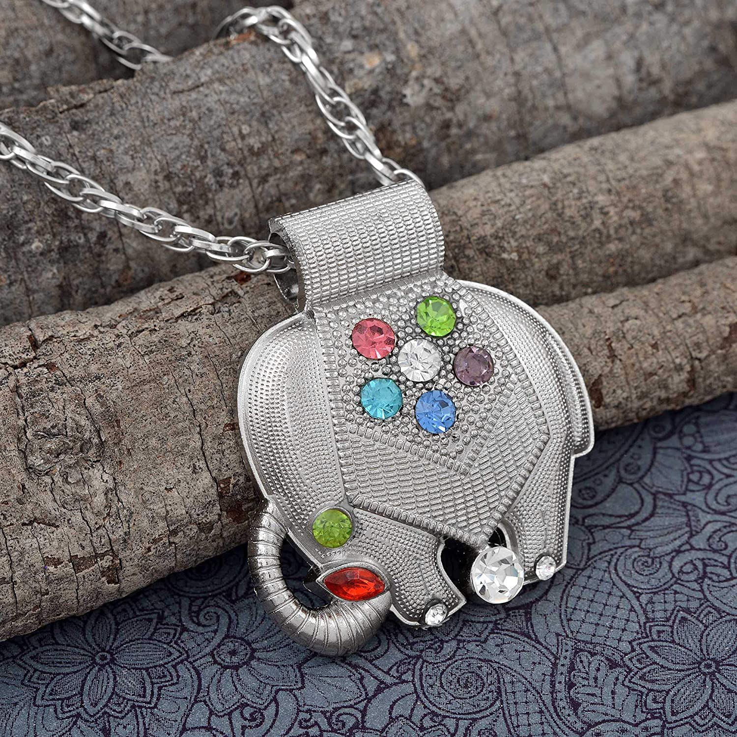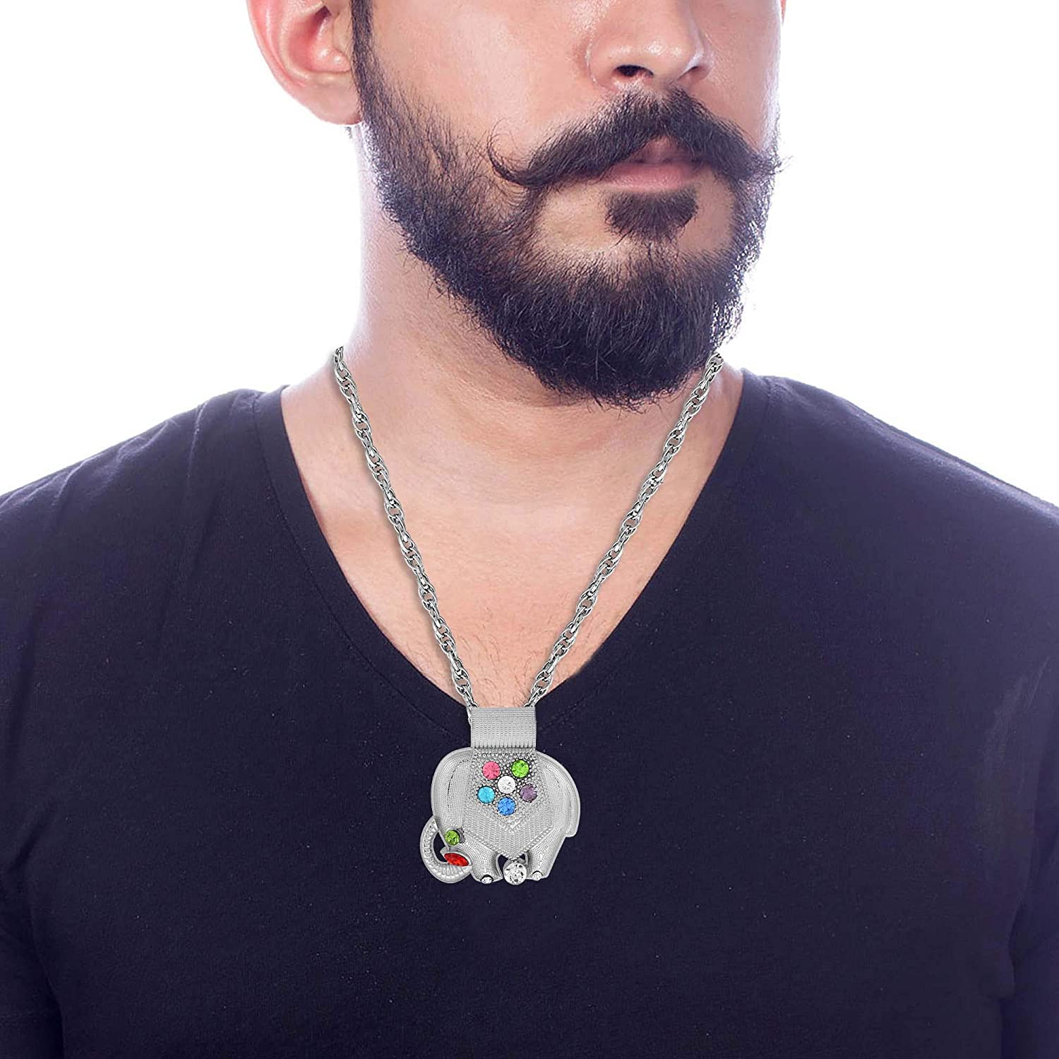 • Silver plated Trunk up Elephant pendant, studded with colourful Cubic Zirconia.