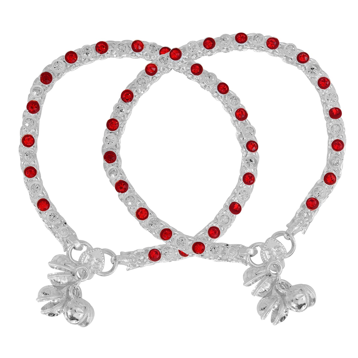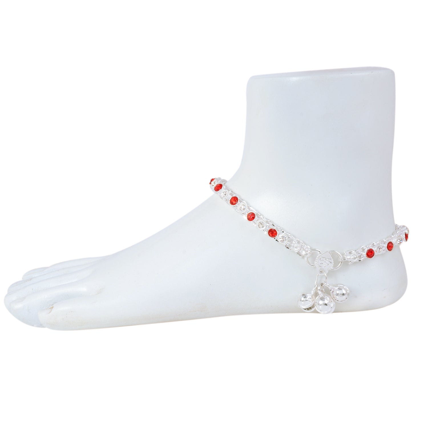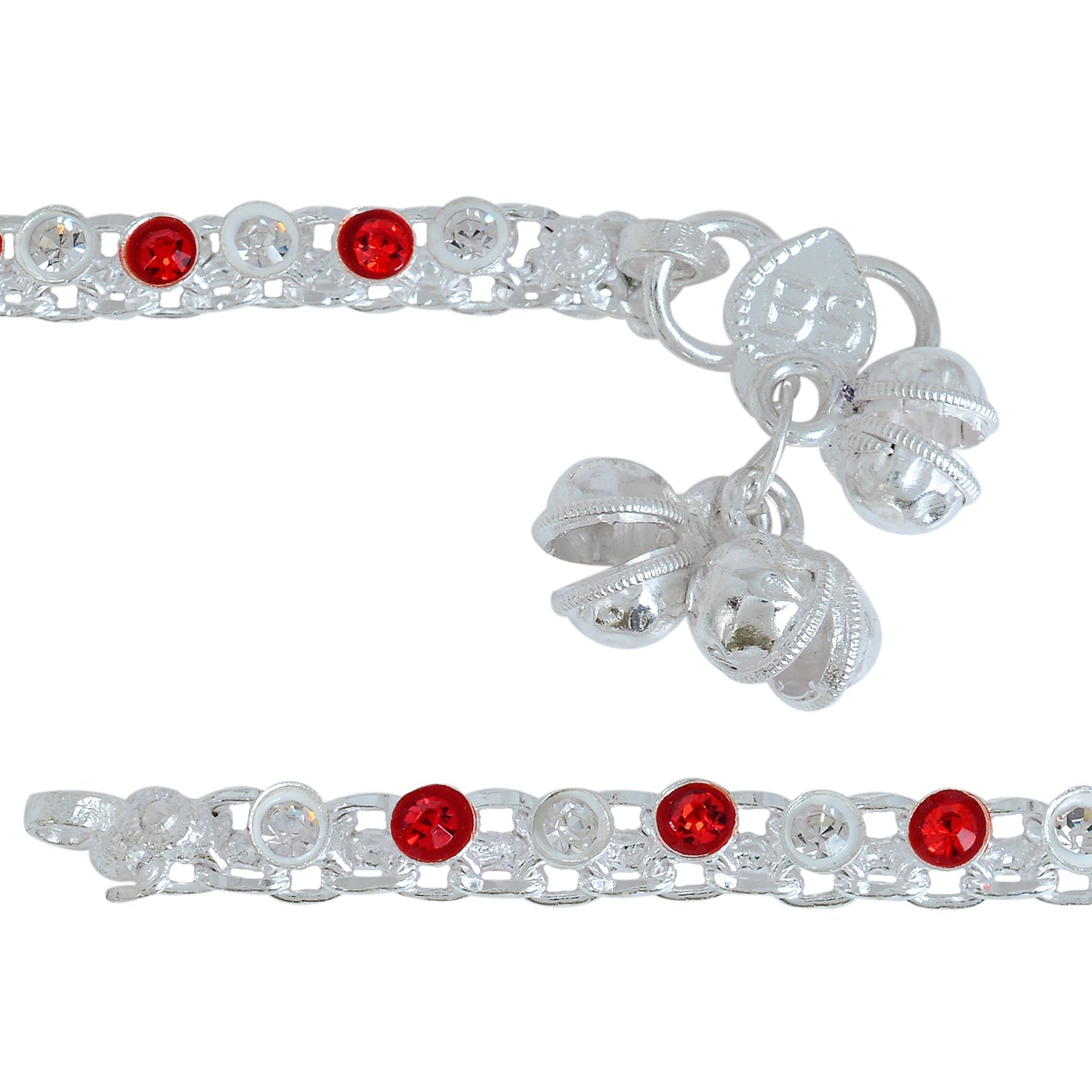 Silver plated flat strand red CZ studded traditional ethnic jewellery Anklet