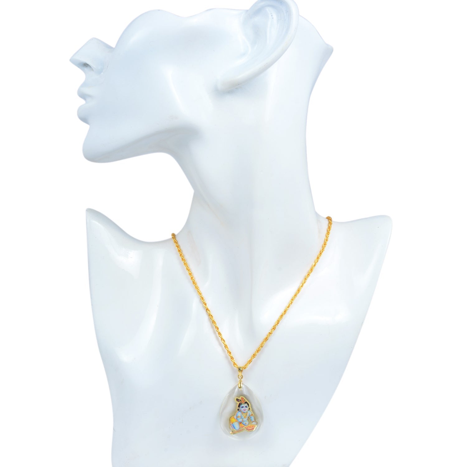 This gold plated krishna pendant, is made by fusion technique, which is not commonly used in jewellery. this innovative, exclusive and designer pendant is also very light weight, and the image it encases, is very attractive, of krishna's childhood, famously called laddu gopal. this religious, aesthetic exquisite gold plated pendant, is exclusive, and attention grabbing. an ideal all occasion, all purpose chain pendant is a rich looking pendant to adorn. it comes in ready to wear condition, with anti allergy, skin safe, gold plated rope chain. a rich looking, designer and unique look jewellery pendant, this can be worn with all dresses, and at all formal and casual occasions. a very good gifting option as well, for all ages.